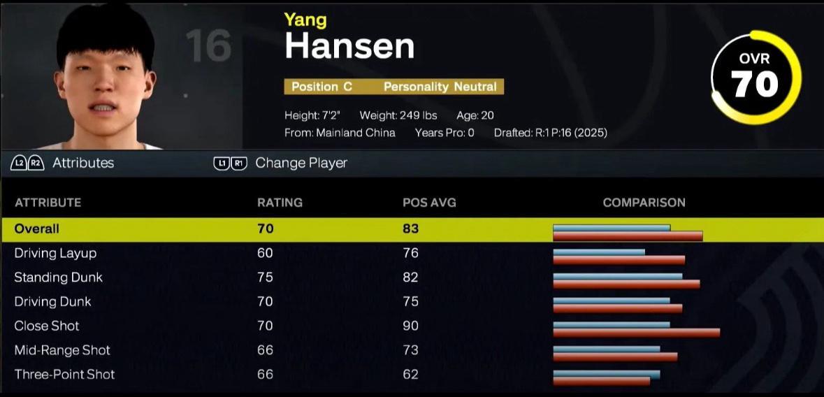 雷速体育8月26日讯 今日,2K指南公布了中国球员,2025年NBA选秀大会16号秀杨瀚森的2K评分,总评为70分,具体细节评分如下。