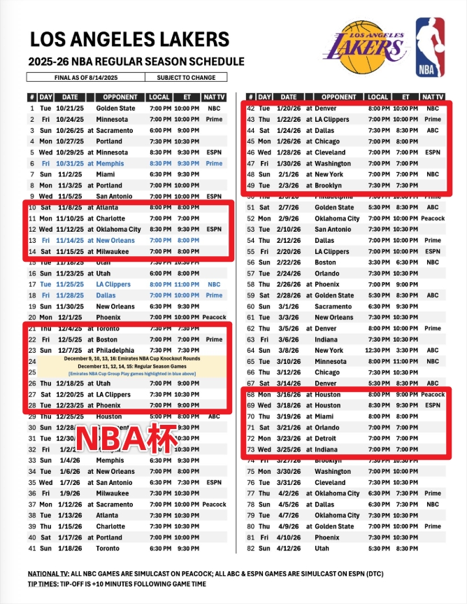 08月15日讯 今日,湖人官方公布了新赛季的完整赛程。