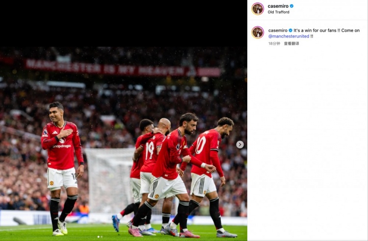 赛后卡塞米罗在社交媒体发文:这场胜利属于所有球迷!继续前进!