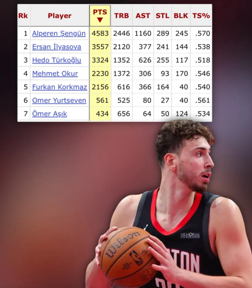 此前休媒晒出申京在25岁及以下土耳其球员中的各项数据排名(评语:他才23岁,他是名副其实的土耳其乔丹)
