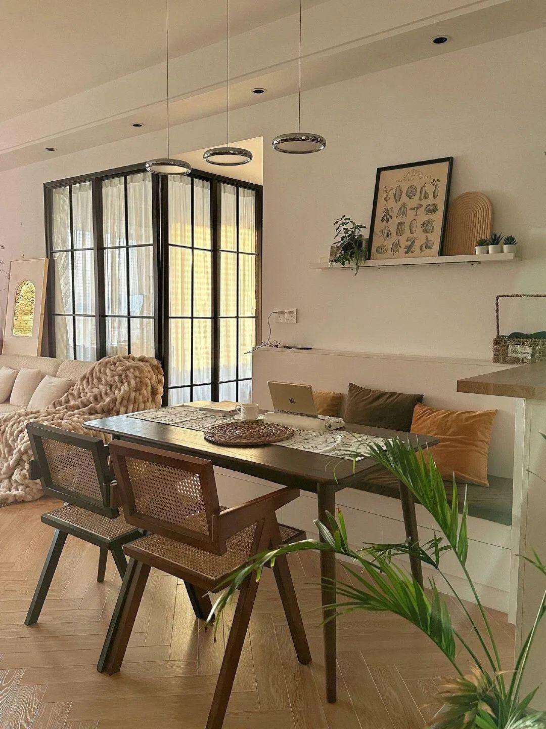 现在,她家入住一年了,用下来觉得这种卡座很香,餐厅区域不占多少地,且这一块收纳力很强,人多吃饭以及平常两人在这边办公都很舒服。