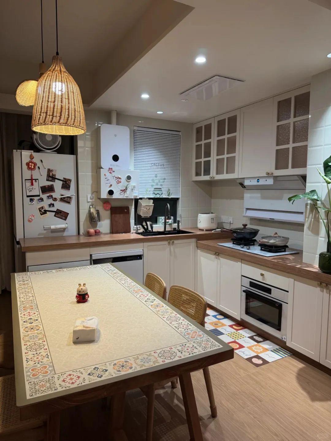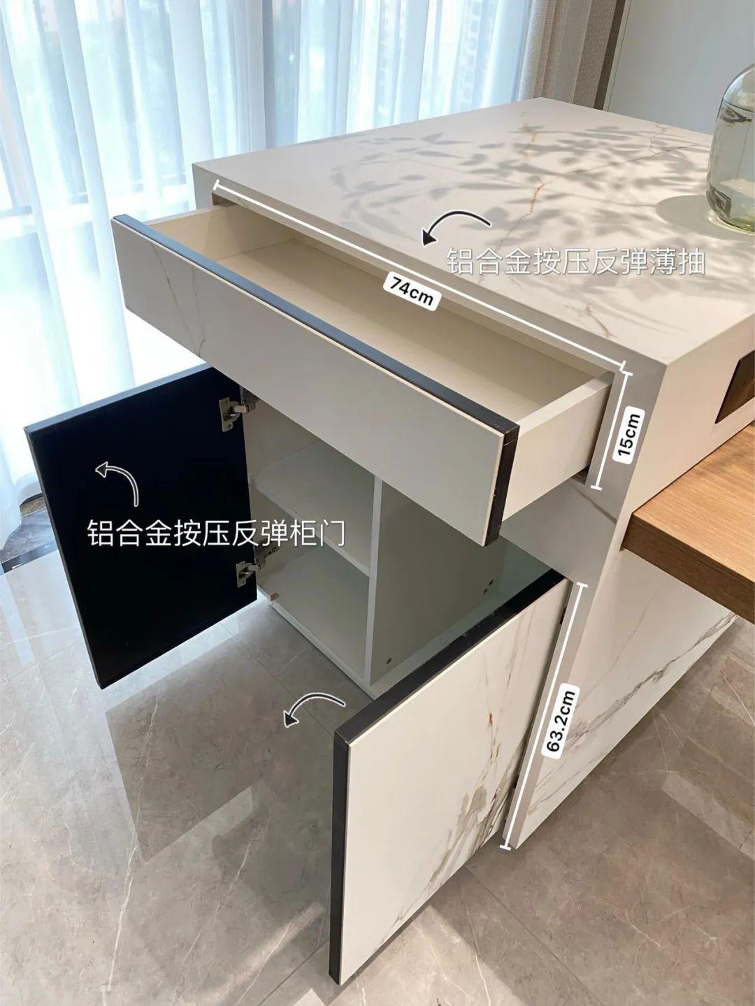网友@一屋所有 家的岛台餐桌实用性拉满,人少时推回去餐桌长1.4米,不占空间,人多时拉出来餐桌长1.8米,能坐下8-10人。