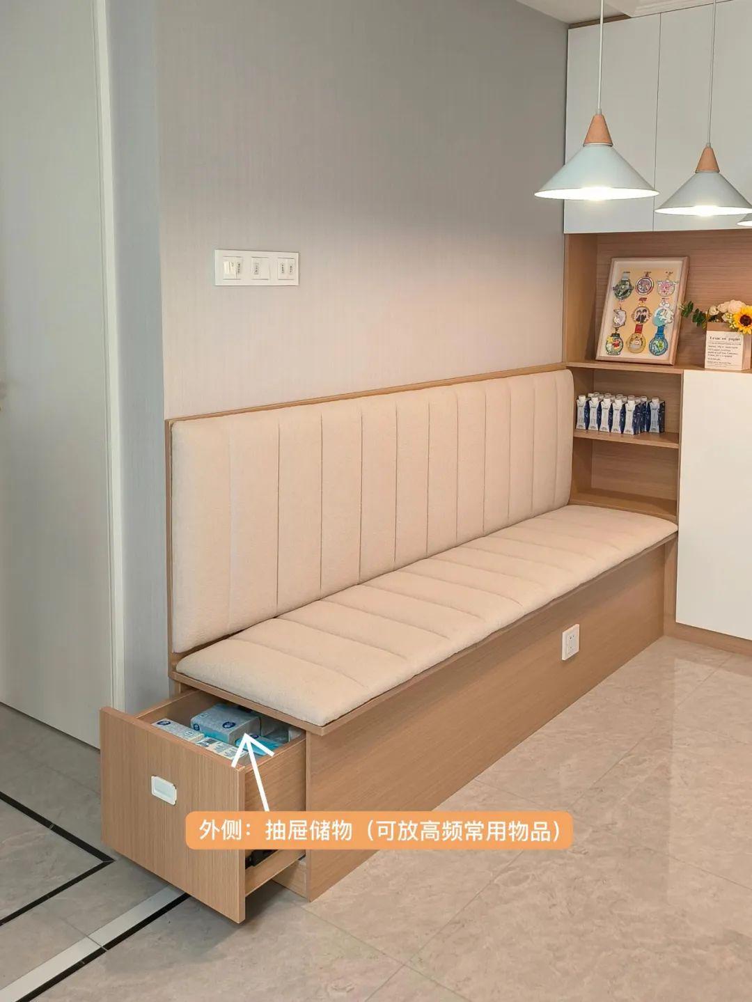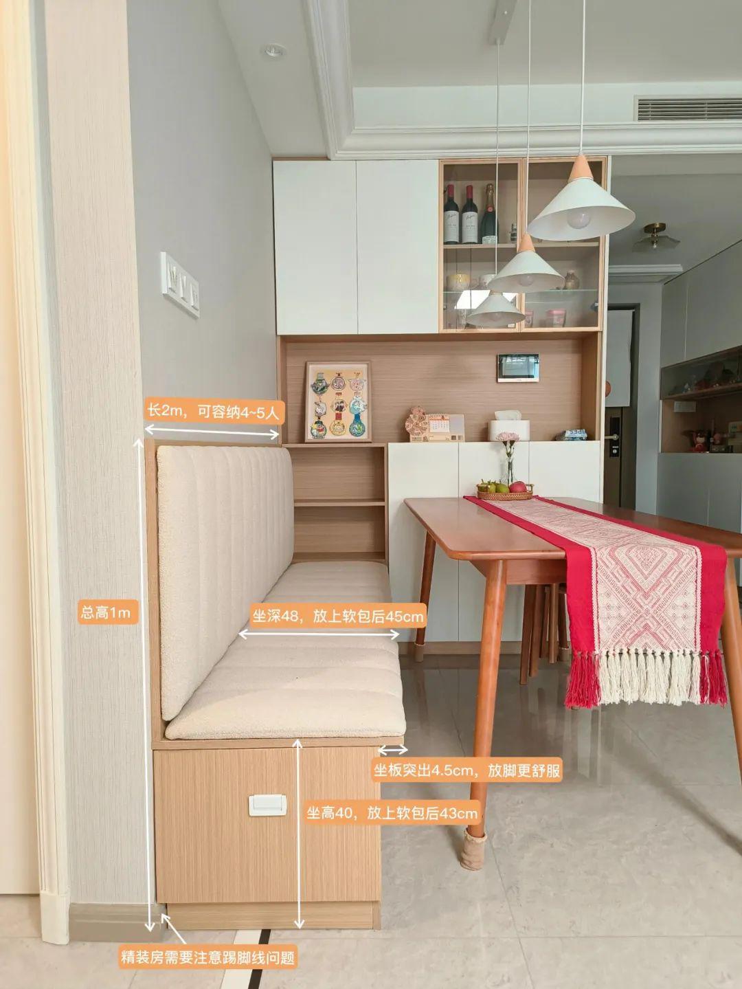 像网友@Lisa家的做法,是卡座+餐边薄柜一体设计。
