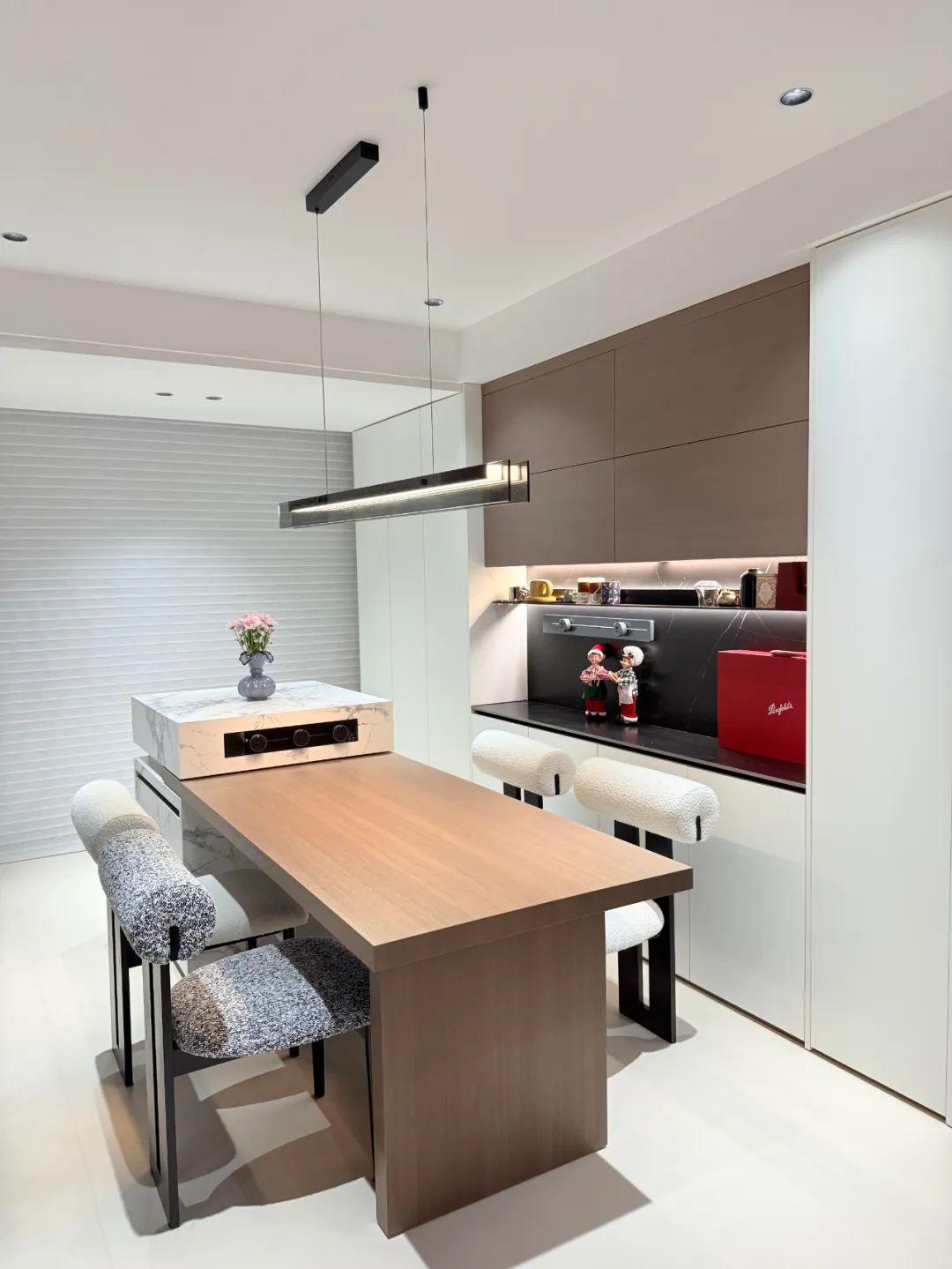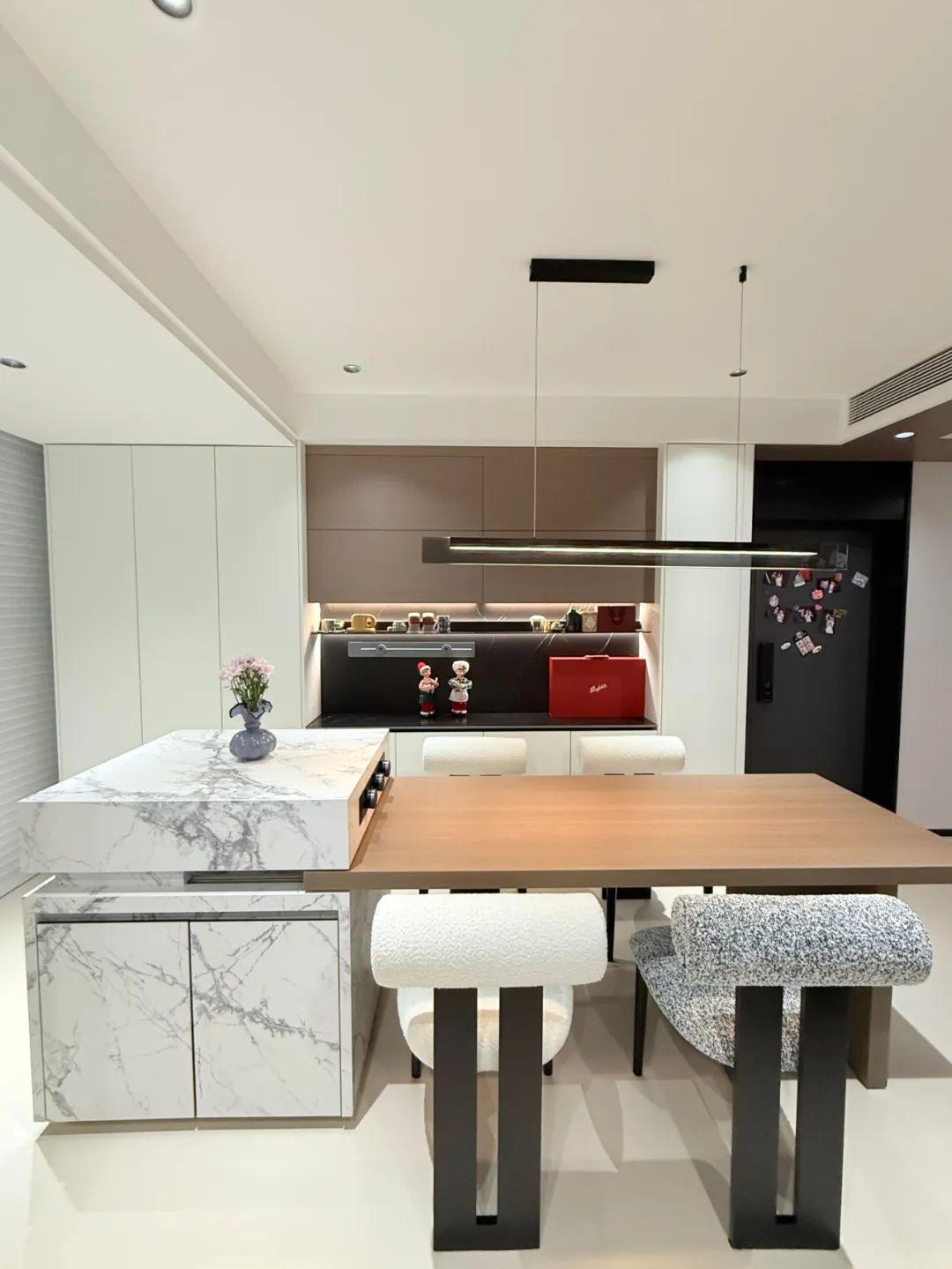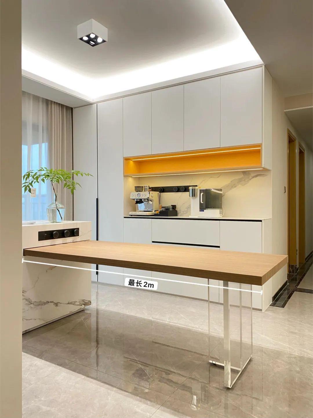 岛台+伸缩餐桌拉伸的设计,既能解决空间小的难题,还能拉伸变大,聚餐使用。